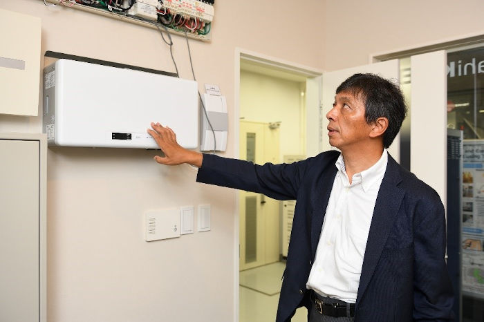 太陽光発電など発電設備で作られる電気は直流。電気器具を使用するにはパワーコンディショナーを通して交流に変換する必要がある。石井教授も研究所にあるパワーコンディショナー(写真左上)を使い、日々研究を進めている