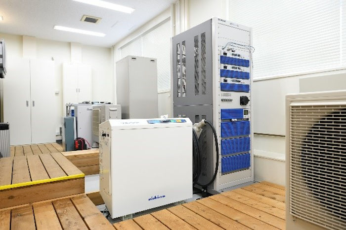 石井教授の研究室。写真右にある青い箱状の設備は電気自動車の蓄電池と同様の機能を内蔵しているシミュレーターで、電気自動車をどのように災害時に役立てられるかを研究する上では欠かせない