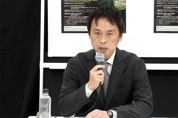 開会に当たり、まずは審査員を務めるEMIRAの亀谷潮太編集長があいさつ。「『住まい方』は、まさに今の時代を象徴するようなテーマ。ぜひ面白いアイデアを聞かせていただいて、日頃の学問の成果を発揮してください」と、最終審査に残った5チームに呼びかけた。