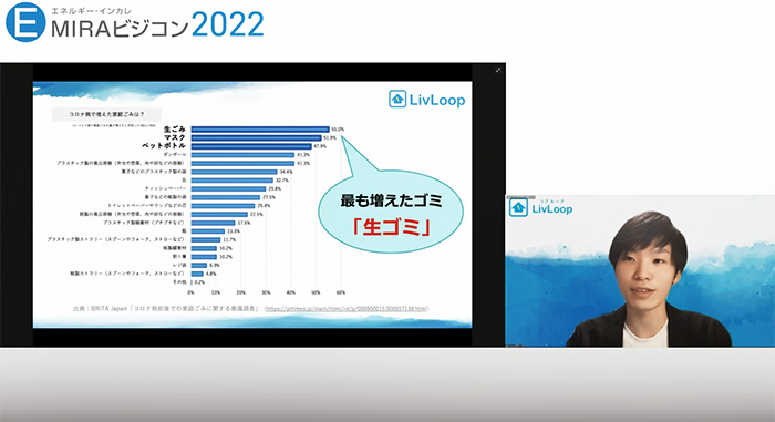 披露したアイデアは、家庭で生ごみの水切りを頑張るだけでお金がもらえるスマホアプリ「LivLoop」。コロナ禍により家庭で過ごす時間が増えたことで、家庭ごみ、特に生ごみの量が増えていることに着目した。