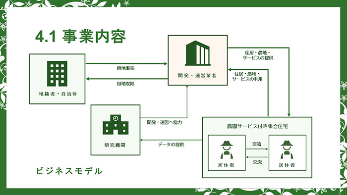 「農耕×テレワーク」のビジネスモデル。既に都市型農園事業やオフィス緑化事業が存在することから、農園サービス付き集合住宅のニーズを訴えた
