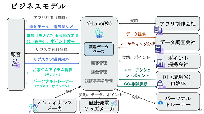 メイン事業として、アプリで収集したデータを企業に有償提供することに加え、サブスクリプションサービスなどで利益を得る。さらに、発電可能な健康グッズによるCO2排出量の削減実績を、環境省が推進するエコ・アクション・ポイント(※)に変えて利用していく。一方のユーザーは、ダイエットをしながらCO2排出量の削減にも寄与できるというアイデアだ。