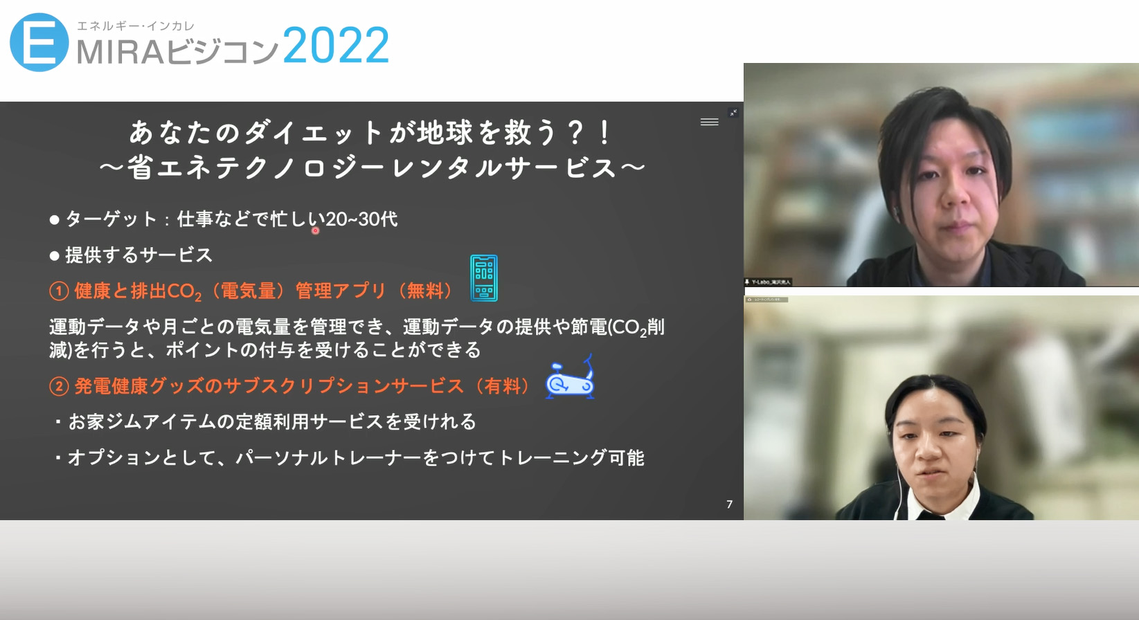 コロナ禍による「住まい方」の変化に、運動不足で太り気味という悩みが増えていることを指摘。運動データや月ごとの電力使用量を管理できる無料アプリと、発電ができるエアロバイクなどの健康グッズをレンタルするサブスクリプションサービスを行う2段構えの事業アイデアを発表した。