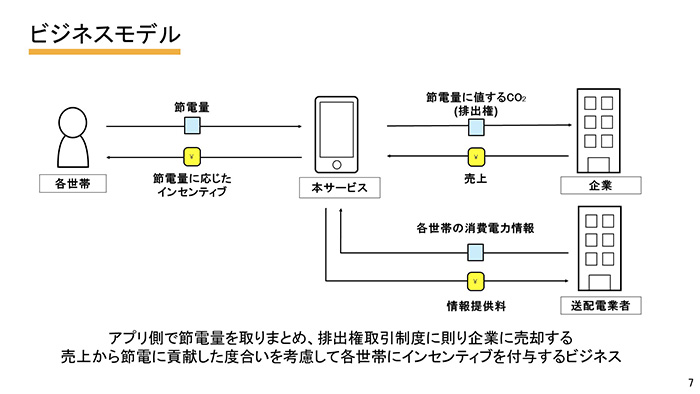 スマホアプリを介して一般家庭の節電量を管理し、その節電量に値するCO2排出量を権利として、企業に売却。その仲介手数料で利益を生む。さらに、各家庭の消費電力情報を送配電事業者にも有償で提供していこうというビジネスモデルだ。