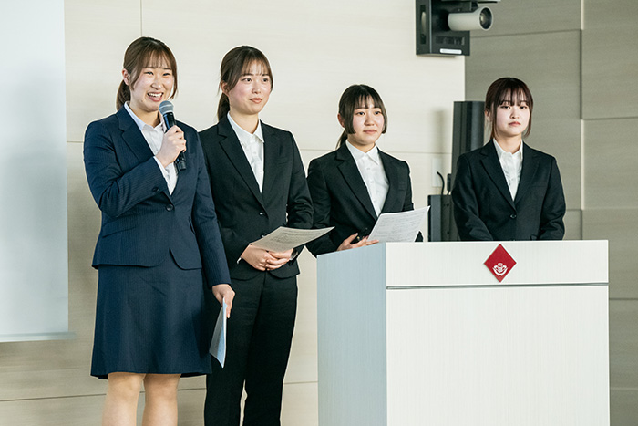 (写真左から)水野英雄准教授のゼミ生9人が協力して考えたアイデア。この日は髙橋華さん、松田成未(なるみ)さん、坂根璃胡(りこ)さん、武藤愛佳(まなか)さんの4人が代表で発表を行った