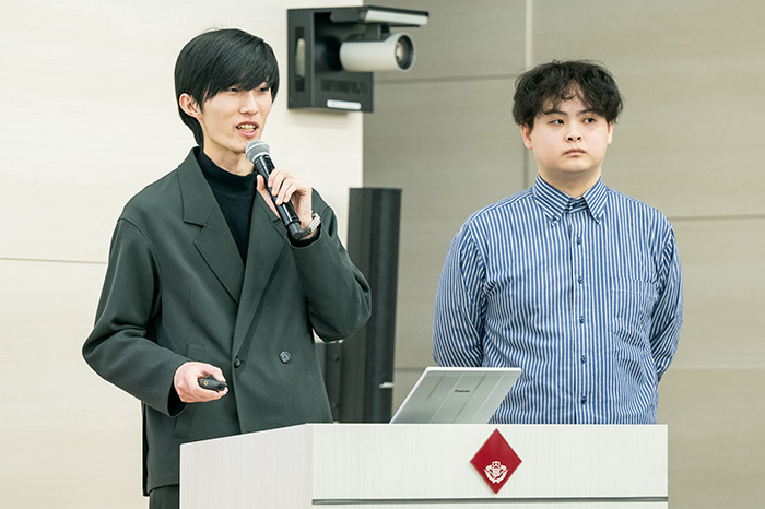(写真左から)これまで「ウェルビーイング(市民の幸福感)」についても学んできた早稲田大学 先進理工学部 生命医科学科3年の倉橋輝(ひかる)さんと、コンサルティング企業へのインターンでデータ解析に携わってきた同大学 社会科学部 社会科学科3年の澤田健佑さん。お互いの経験を生かした内容だった