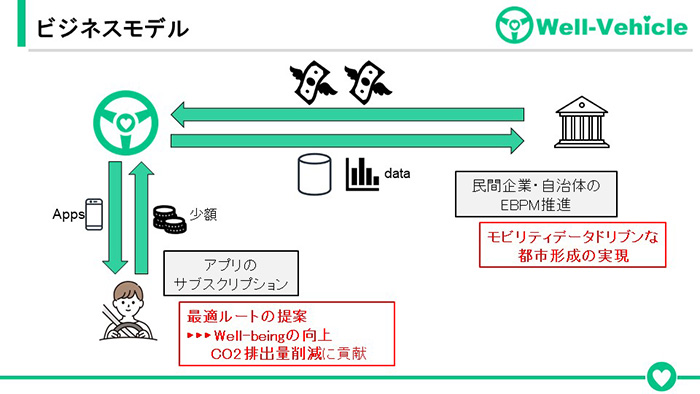 3番手として登壇したのは、早稲田大学3年の2人による「Well-Vehicle」。ITを用いて安全で利便性の高い交通社会を実現したスマートシティの仕組み作りをビジネスアイデアに落とし込んだ。