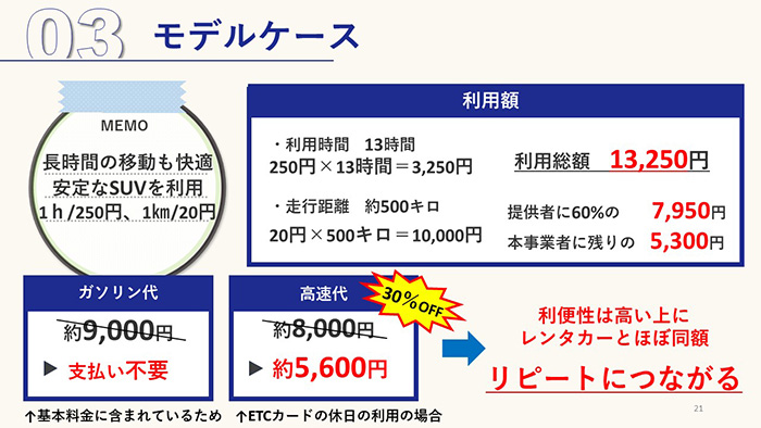 「カルノリ」を利用した際の料金モデル。レンタカーとほぼ同額だが利便性は高いため、競争力があると訴えた