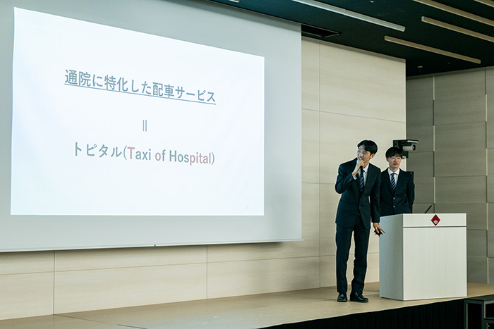 その結果集まった142のビジネスアイデアの中から頂点に立ったのは、東京大学 工学部の学生2人によるチーム「ひかり」。高齢者をターゲットにした、手軽で安価な通院用相乗りタクシーの配車サービス「トピタル(Taxi of Hospital)」というビジネスアイデアだ。