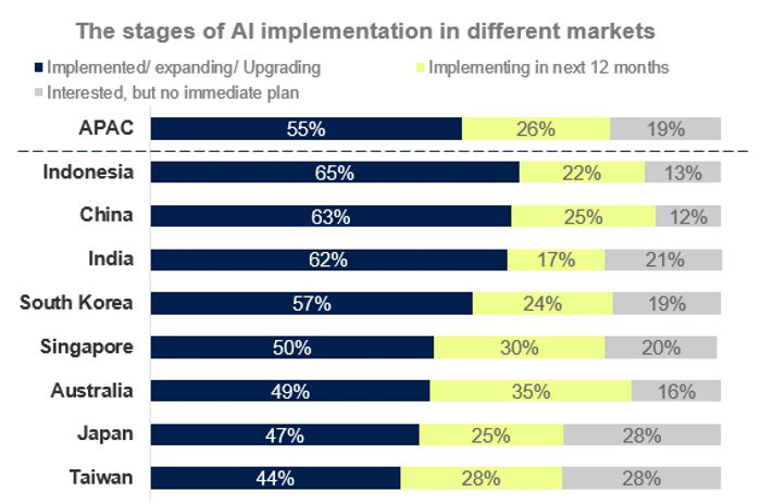 APAC(アジア太平洋)における企業のAI導入率。シンガポールやインドネシアといった8つの市場で、ビジネスリーダーなど260人を対象に調査。グラフは左からAI導入済み、12カ月以内に導入予定、当面予定はない、という回答を示す