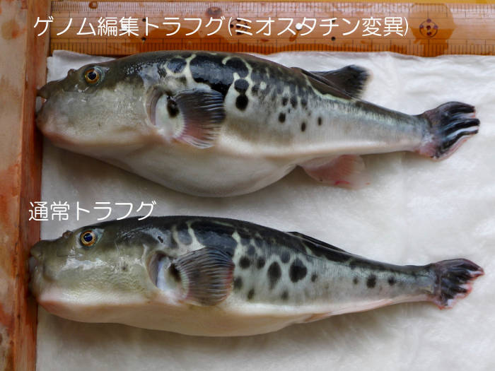 木下氏は、狙った遺伝子のDNAを一部切除することができるゲノム編集技術「CRISPR-Cas9(クリスパー・キャス9)」を用いて、マダイが持つミオスタチンの遺伝子を破壊(卵の時点で、ミオスタチンの遺伝子に作用する酵素を注入)。ミオスタチンの機能を欠損させたマダイを、ベルジアン・ブルーなどと同じように、筋肉質な「肉厚マダイ」へと成長させることに成功した。豊満なトラフグも、同じ要領で「食欲」を抑える遺伝子を破壊し、より早く成長するよう編集されている。