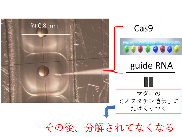 CRISPR-Cas9で、遺伝情報の処理を行うRNA(リボ核酸)という核酸を注入してミオスタチンを欠損させる。この注入作業は卵一つ一つに手作業で行うそう