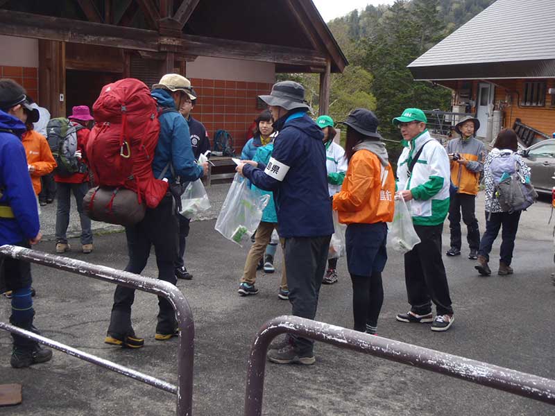 入山口でゴミ袋を配布。観光客に自分が出したゴミは自宅に持ち帰ってもらうための啓蒙活動を展開している