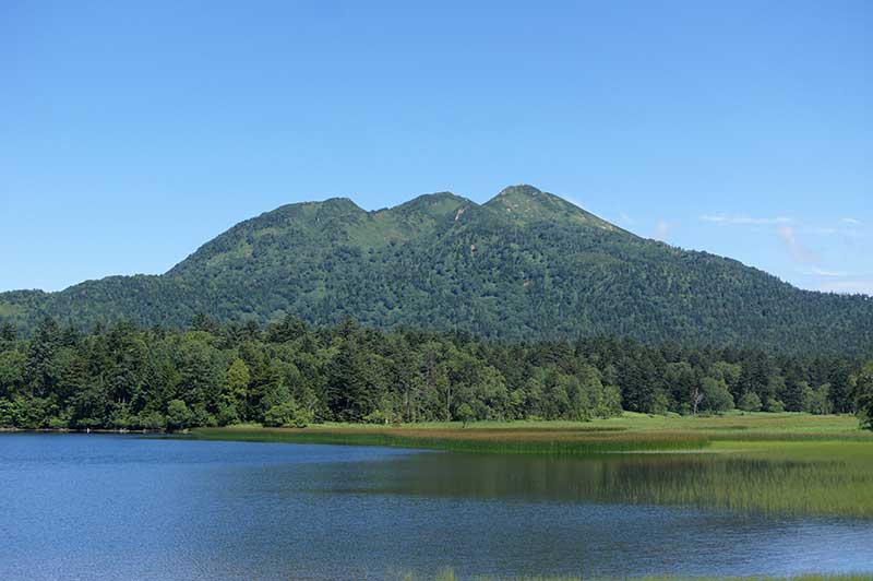 尾瀬沼のほとりから、東北地方で最も高い山・燧ケ岳(ひうちがたけ)を望む