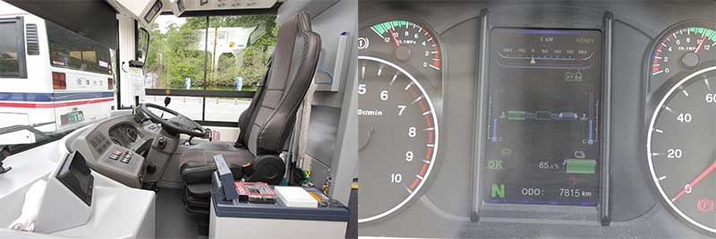 コックピットは一般的なバスと変わらない。インストゥルメントパネル中央にバッテリー残量が表示される