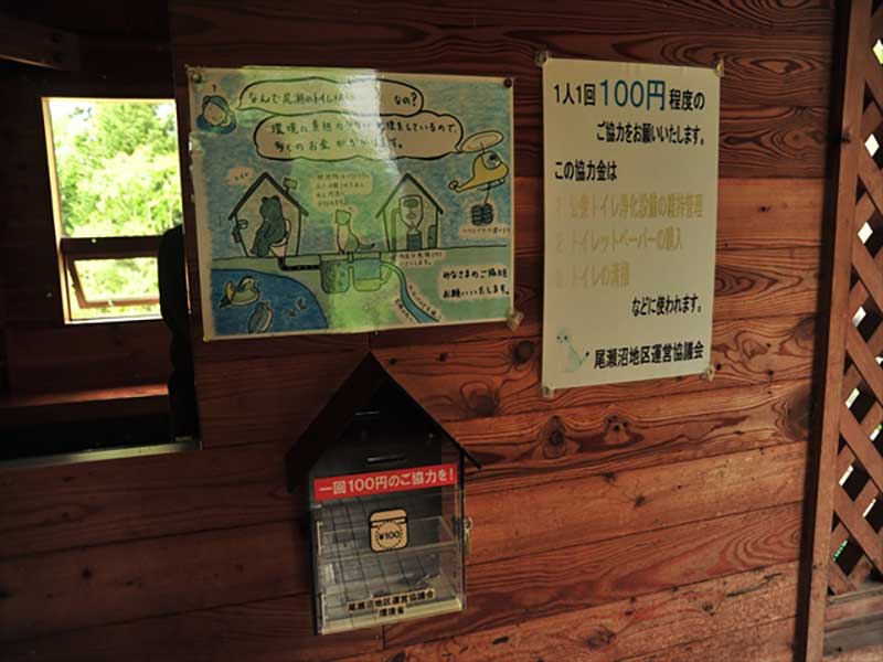 尾瀬沼ビジターセンターに隣接するトイレ。利用者には、管理維持のためのチップ制への理解を求めている