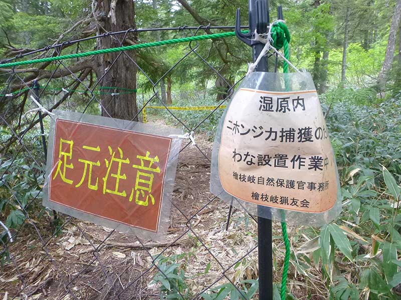 林野庁によって大江湿原に設置されている防鹿柵。環境省と地元猟友会の連名で観光客向けの注意喚起の看板が掲示されている