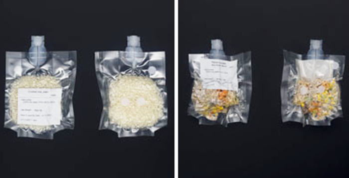 JAXAが認証している宇宙日本食の一例。写真左はお湯を入れたら復元できる尾西食品の白飯。写真右は飛散しないようにスープと麺が宇宙仕様になっている日清食品のしょうゆラーメン。他にシーフード、カレー味も