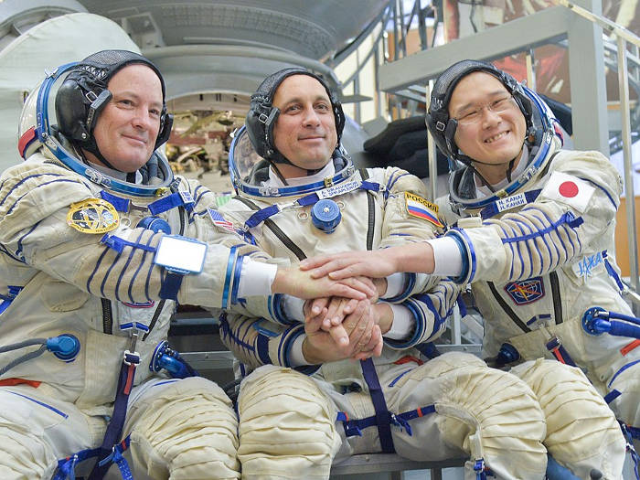 ソユーズ宇宙船に搭乗する直前に地上で撮影された金井宣茂さん(右)ら3人のクルー。2017年12月17日にカザフスタンから打ち上げられた