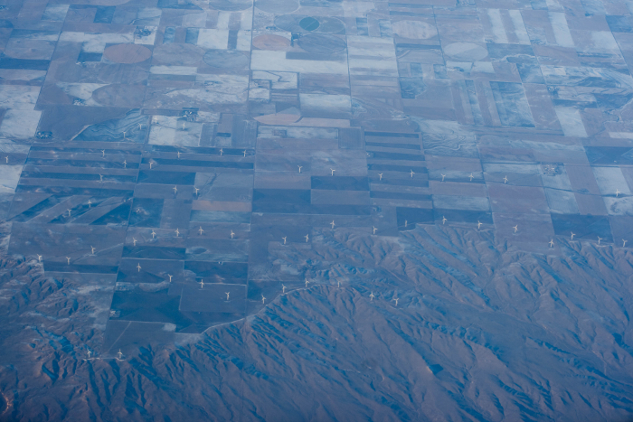 上空から見たドイツの風力発電所。田園風景に風力発電機がずらっと並んでいる
