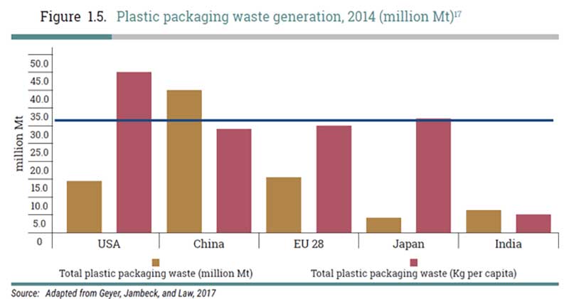 人口1人あたりのプラスチック容器包装廃棄量をアメリカ、中国、EU、インド、そして日本で比較したデータがある。これによると日本はトータルの廃棄量こそ最小だが、人口1人あたりの廃棄量では中国やEUよりも多いということが明らかとなっている。