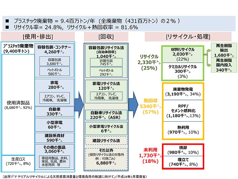 プラスチックゴミについては「リサイクル」が25%、「熱回収」が57%。「未利用」が18%。このうち「リサイクル」の比率を上げていくことが目下の課題だ