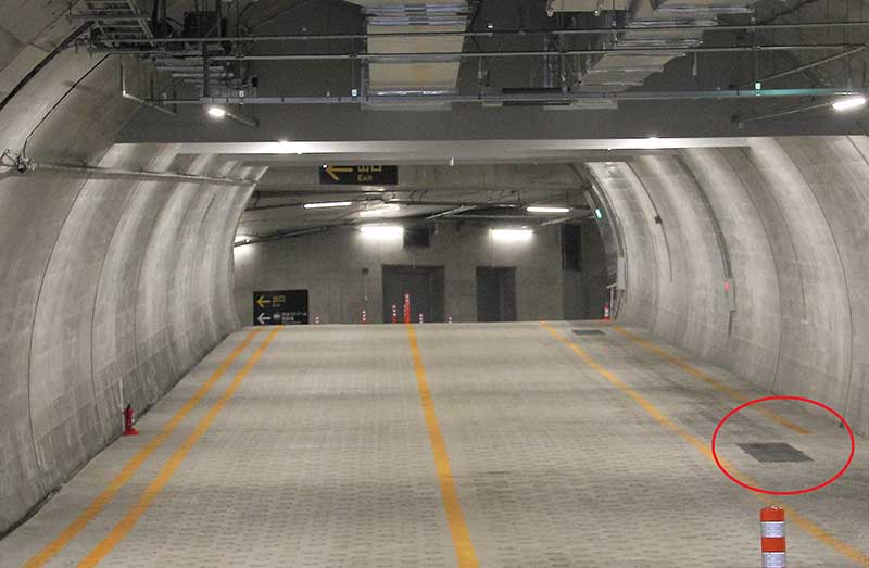 地下トンネルの路面右側、四角い蓋の下(画像の赤囲み部分)では、渋谷スクランブルスクエアと渋谷ストリームの間を温水管・冷水管が結んでいる。この管を介し、2施設は熱融通で連携している