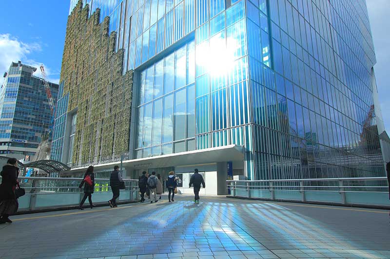 低層部の外装は新国立競技場も手掛けた隈研吾氏のデザイン。「『街のダイナミックな“流れ”を可視化しつつ、熱負荷の軽減を担ったチャレンジングなデザイン・ディテール』と伺っています」(上田氏)