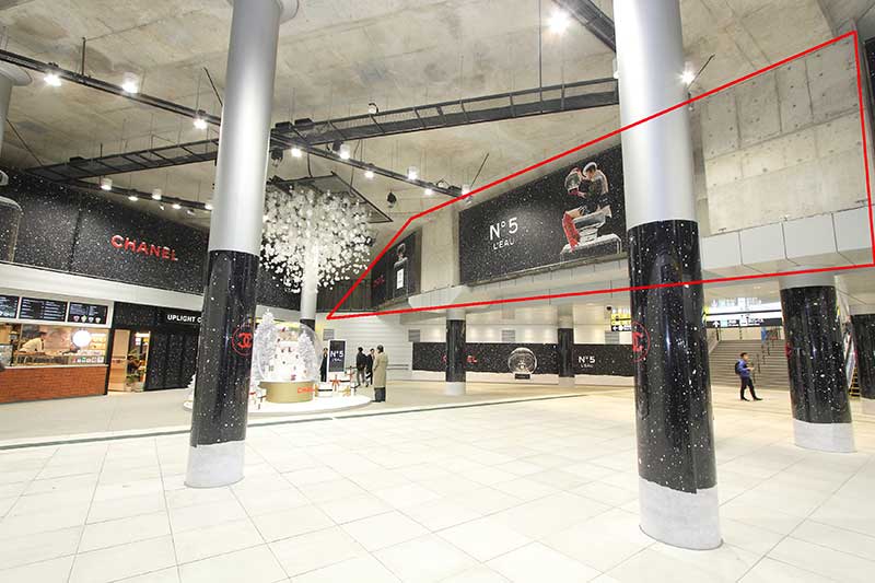 地下1階に接する東口地下広場。鉄道各線への通路が合流するこの場所は、実は“渋谷川”が地下水路として南北に流れている(画像右上の赤囲み部分)。建築面において、渋谷スクランブルスクエアは敷地内を川が縦断している点も大きな特徴