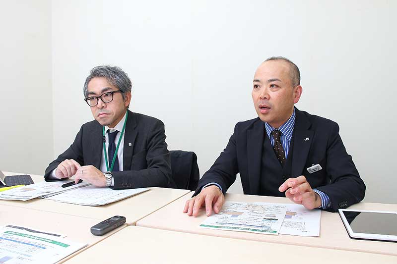 今回話を伺った東日本旅客鉄道株式会社 東京支社 事業部 首都圏えきまち創造センター 横浜グループおよび横浜支社 事業部 不動産活用課の藤ノ木 彰担当課長(右)と、株式会社JR東日本建築設計 商業設計本部 商業第2部門の青木豊実設計長