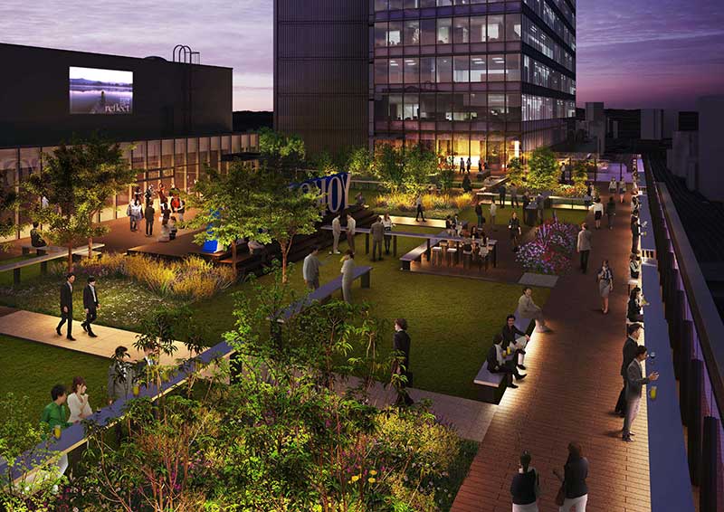 地上12階の屋上空間に造られる、緑あふれる落ち着いた雰囲気の「うみそらデッキ」。西口広場から屋上の緑化の視認が得られるよう、高木も配置される