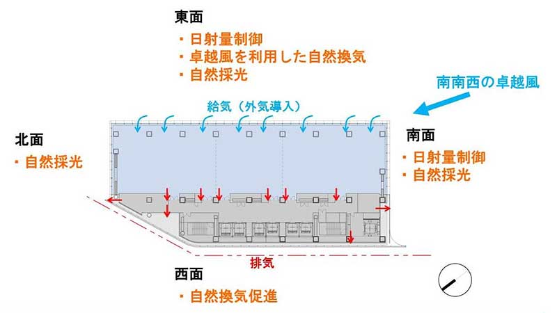「最も特徴的なのがオフィスエリアと、4階分の吹き抜けのあるアトリウムの自然換気で、特に中間期(春・秋)の空調負荷軽減により省エネに寄与します。ビルの南南西から東北東まで年間で約51%吹くとされる、横浜ならではの卓越風(そのエリアで、年間で最も多く吹く風向の風)を上手く取り入れます。どこから風を入れて、どこから排気すれば十分な換気が可能なのかシミュレーションを重ね、開口の大きさや排気位置などを検討してきました。ビルの高層棟の外壁に凹凸があるのもその検討の一案で、圧迫感をなくすというデザイン面だけではなく、風の環境を整えて安定させ、より排気を促しやすくする意図もあるのです」(青木設計長)
