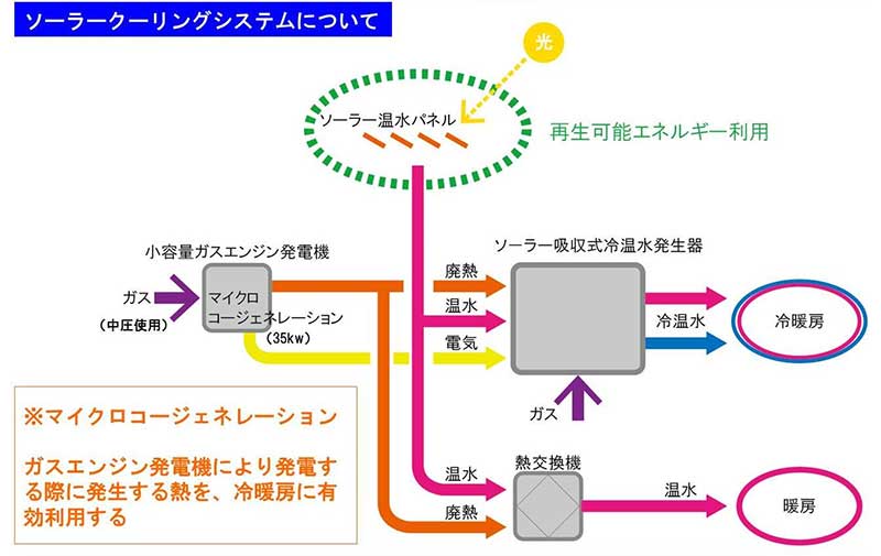「屋上に設置された蓄電式太陽光パネルは、主に館内照明などの電力エネルギーとして活用しますが、空調熱源としては、太陽熱を利用した『ソーラークーリングシステム』も用います。この熱源システムには『マイクロコージェネレーション』も組み合わせており、ガスエンジン発電機により発生する廃熱も、冷暖房などに有効利用します。このように、通常は発生してもそのまま捨ててしまう熱エネルギーも積極的に利用しています」(青木設計長)