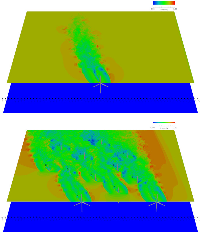 大規模な洋上のウインドファームにウエイクロスはつきもの。RIAM-COMPACTでは、風上の風車(左)に干渉された風が、どのように変化しているかをアニメーションで示すことができる