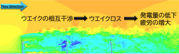 「洋上風力発電は、何十台もの風車を並べて発電しますが、風上の風車が受ける風と、風下の風車が受ける風は明らかに異なります。例えば、風上から10番目の風車は、風上の風車の影響によるよどんだ風を受けることになるので、一番前の風車に比べると発電量にはかなりの開きが生じてしまうのです」