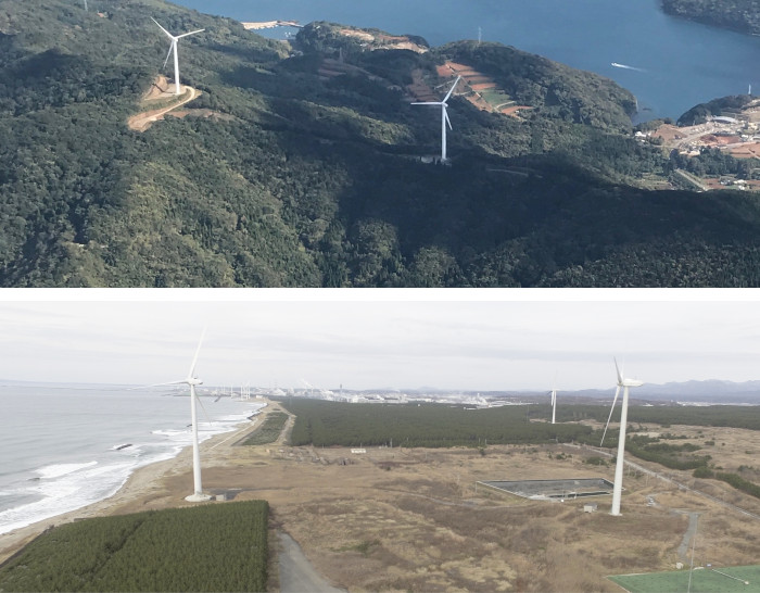 東芝エネルギーシステムズの発電所が山間部(上)にあるのに対し、日立造船の発電所は沿岸部(下)に位置する。この対照的な環境に置かれた風車を使い、実測やシミュレーションを行っている。結実した技術は特許申請済みだ