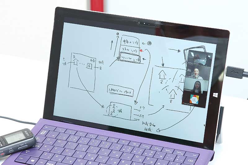 ホワイトボードをカメラで映し、図解を起こしながら丁寧に解説してもらった。これを目の当たりにすれば、確かに遠隔でのディスカッションも容易に行えるのではと実感できた