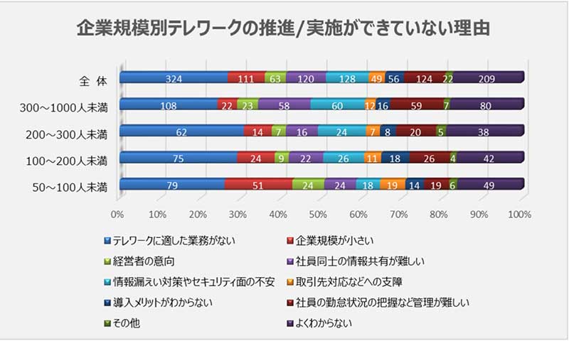 調査対象の内「テレワーク・デイズ2019」非参加企業・団体の人々へ「所属組織でテレワークが進まない、実施できない理由」を尋ねたところ、「テレワークに適した業務がない」「よくわからない」などの回答が多く、昨年の時点ではまだまだテレワーク導入の漠然とした難しさを感じていたことがうかがえる
