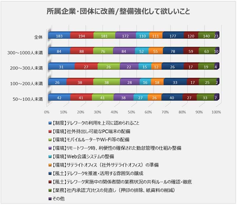 「テレワーク・デイズ2019」非参加企業・団体の人々へ「所属組織にテレワーク実現のため改善・強化してほしいこと」を質問し、「社外へ持ち出せるパソコン、Wi-Fi環境などの配備」「利便性のある勤怠管理」などの改善を望む声が集中したほか、「テレワークを認める社内制度の整備を」といった意見も寄せられていた。こうした要望に応えることが今、急務となっている