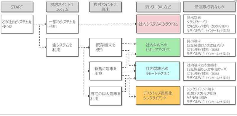フローチャートを基に4タイプのテレワークスタイルから提案。「自宅から社内環境へリモートアクセスできる方式もありますが、この1~2カ月の変化は著しく『会社のデスクトップパソコンをどうしても自宅で使いたい』という相談もあったようです」(岡氏)