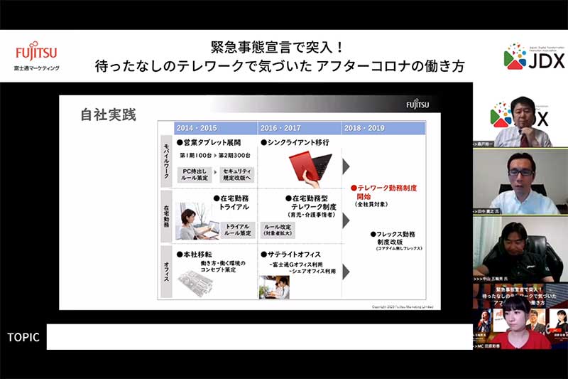 富士通マーケティングとしてもそれらの働き方を提案、または自社でも取り組むビジョンも想定していた。だが、新型コロナウイルスの影響は、テレワークを“在宅”一点集中で加速させる状況を生んだ。