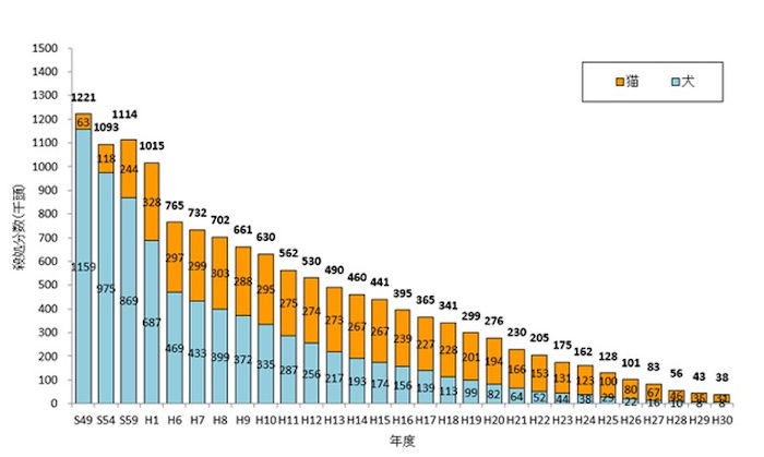 全国の保健所や動物愛護センターなどで殺処分された犬と猫の数。年々減少してはいるものの、2018年には犬7687匹、猫3万757匹が対象となった