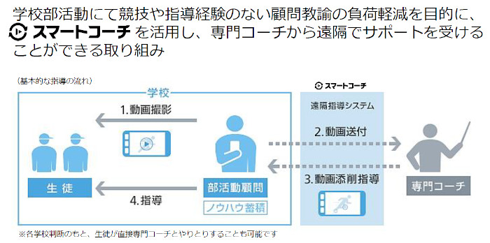 これは、野球や卓球、バレーボールなど各競技の専門コーチが、専用アプリを使って生徒たちのフォームなどを動画でチェックし、添削やアドバイスを行うというもの。