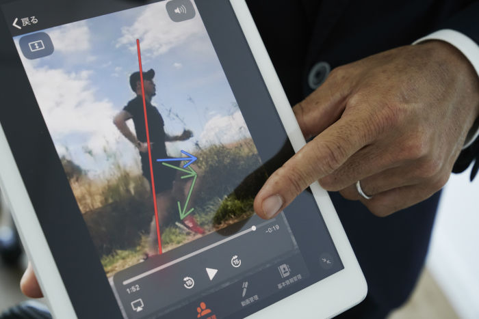 アプリ画面の一部。指導するトレーナーは、送られてきた動画に直接指で書き込むことができる