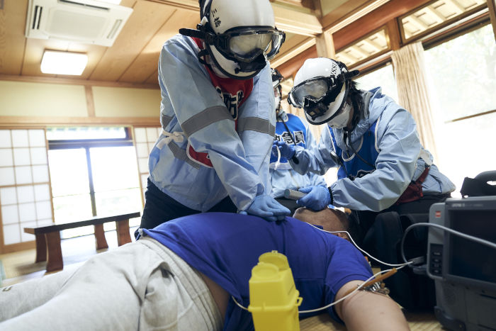 2020年9月に日本体育大学で救急救命士を目指す学生向け教材の撮影が行われた。同大の指導教員たちが実践さながらの演技を見せる