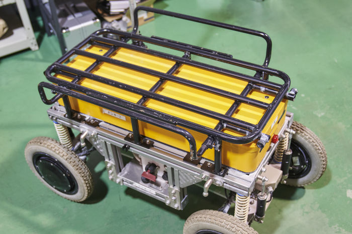 現状ではインホイールモーターを4つ付けており、電力稼働で最高時速は6km程度。追従機能を使うときは1回の充電で4時間稼働できる。農作業現場において重い荷物を載せ、しっかりと作業者についていく「DONKEY(=ロバ)」と名づけられたのもその所以だ