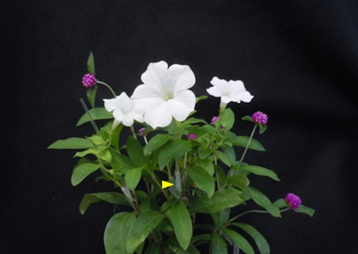 タバコの仲間のペチュニア(白)穂木と、センニチコウ(ピンク)台木の接木。黄色い矢印の部分が接木の部分