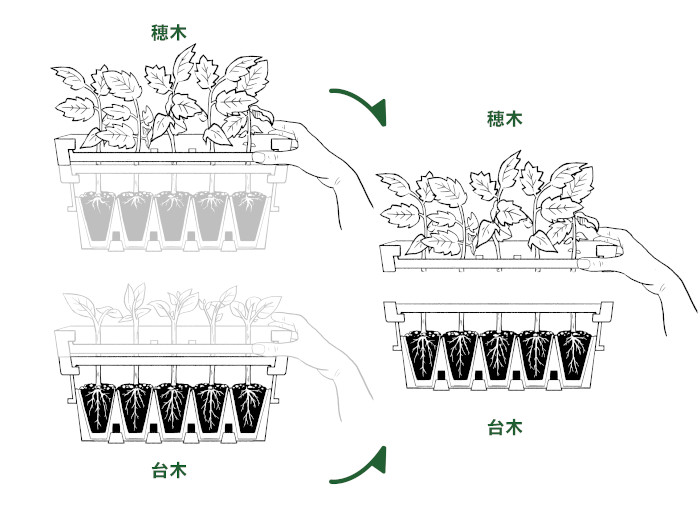 接木カセットは、穂木と台木を分けてセットするだけで接木ができる