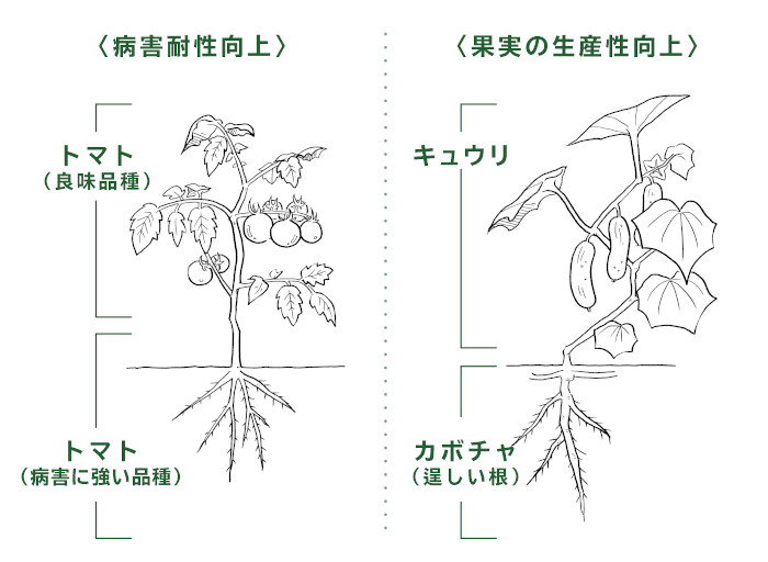 味は良いものの病害に弱いトマトを、病害に強いトマトの根とつなぎ合わせることで耐病性を向上させたり、キュウリの苗を栄養吸収率の高いカボチャの根とつなぎ合わせることで成長スピードを上げるなど、組み合わせ次第でさまざまな弱点を補い合って、生産性・安定性がアップする可能性がある