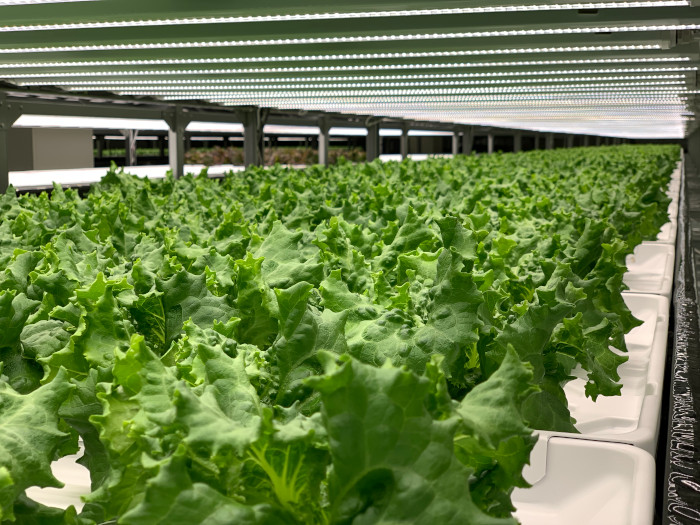 使われなくなっていた倉庫を改装して、植物⼯場として再利⽤。現在は1⽇当たり約1tのリーフレタスを出荷しており、2021年夏までに1⽇に最⼤5tの生産を⽬指している